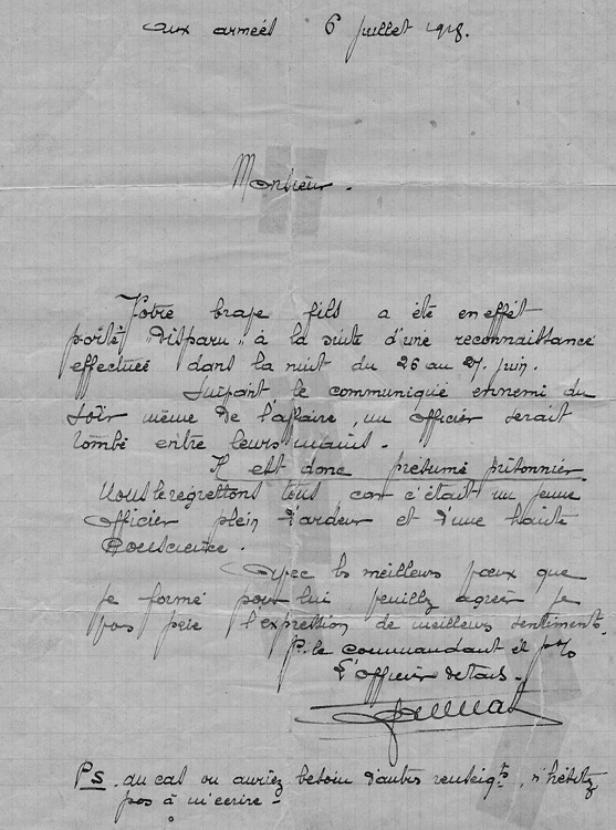 "la capture d'un jeune officier français", ce qui permit à ses chefs de rassurer ses parents.