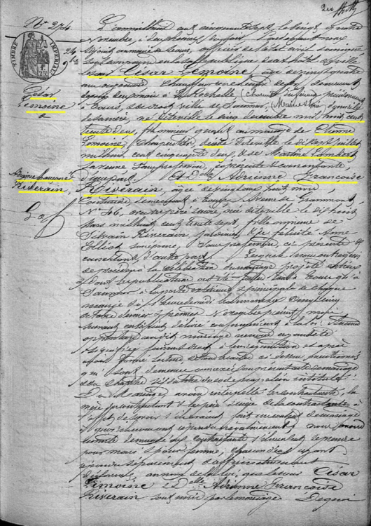 L’an mille huit cent cinquante sept le vingt quatre novembre à deux heures du soir par devant nous l’adjoint au maire de Tours, officier de l’état civil soussigné …/… le sieur César Lemoine âgé de vingt quatre ans et onze mois, chauffeur au chemin de fer demeurant …/… à la Rochelle (Charente inférieure), précédemment à Tours… ville de Saumur (Maine et Loire), domicile de la mère, né à Octeville le cinq décembre mil huit cent trente deux, fils de monsieur …/… de Etienne Lemoine, charpentier, décédé à Octeville,le dix sept juillet mil huit cent cinquante deux, et de Martine Lambert sa mère sans profession, et présente …/…et Demoiselle Adrienne Françoise Riverain âgée de vingt deux et huit mois, couturière, demeurant à Tours, Avenue de Grammont n°46 avec son père, née de cette ville le dix huit mars mil huit cent trente sept, fille …/...