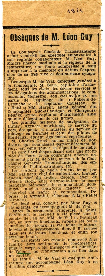 Il aurait aimé suivre la carrière de médecin de marine mais son père, Pierre Aimé Léon GUY né en 1833, capitaine au long cours disparut en mer (date inconnue), Léon en fut empêché par son dévouement filial car il fut soutien de famille de bonne heure.