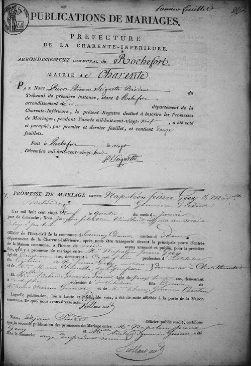 Promesse de mariage de Napoléon Pierre Guy agé de 23 ans, avec Adelaide Geneviève Guinot agée de 28 ans.