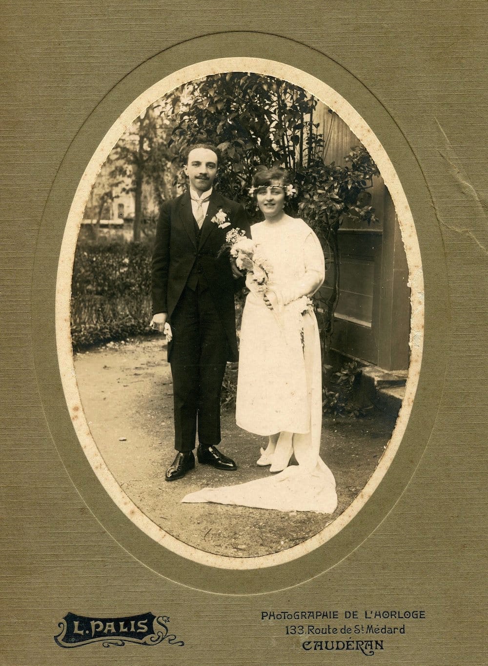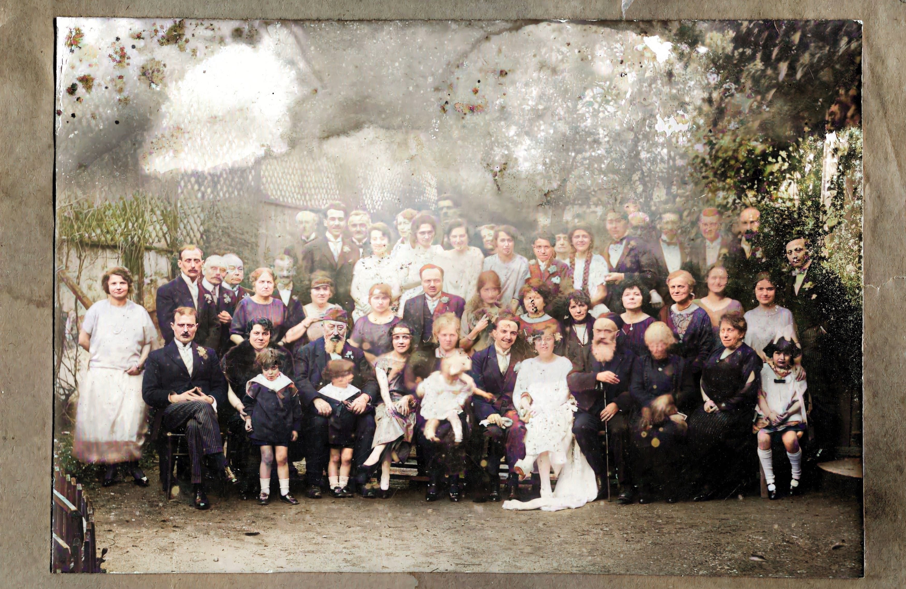 Sur cette vieille photo qui a vécu, on reconnaitra, hormis les mariés, à droite de Madeleine, Léon et Gabrielle Guy (née Ducamp), à l'extrème droite debout, Pierre Avril et au dernier rang à gauche et en 4ème position, Juliette Avril.